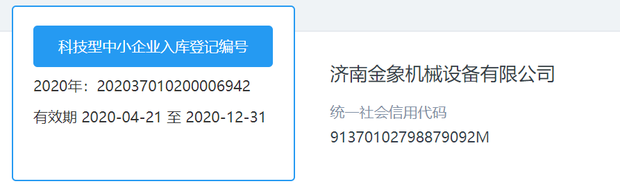 根據(jù)《科技型中小企業(yè)評價(jià)辦法》(國科發(fā)政〔2017〕115號)和省科技廳《關(guān)于開展2020年科技型中小企業(yè)評價(jià)工作的通知》等文件有關(guān)規(guī)定,現(xiàn)認(rèn)定濟(jì)南金象機(jī)械設(shè)備有限公司成為“國家科技型中小企業(yè)”,編號:202037010200006942。
